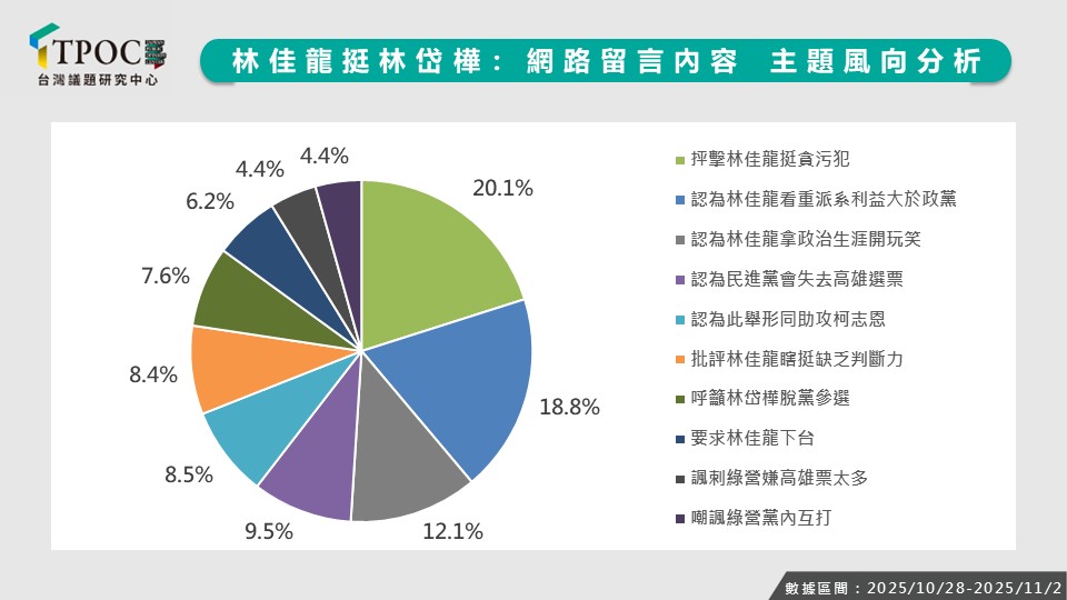 從熱門討論風向進一步分析,可見多數網友都不理解林佳龍的決定,有20.1%「抨擊林佳龍挺貪污犯」、18.8%「認為林佳龍看中派系利益大於政黨」、12.1%「認為林佳龍拿政治生涯開玩笑」、8.4%「批評林佳龍瞎挺缺乏判斷力」、6.2%「要求林佳龍下台」,這些抨擊聲量合計佔65.6%,足見此一舉動在輿論間引發強烈反彈,不僅動搖其過往形象,也讓外界質疑他為派系鋌而走險的動機。