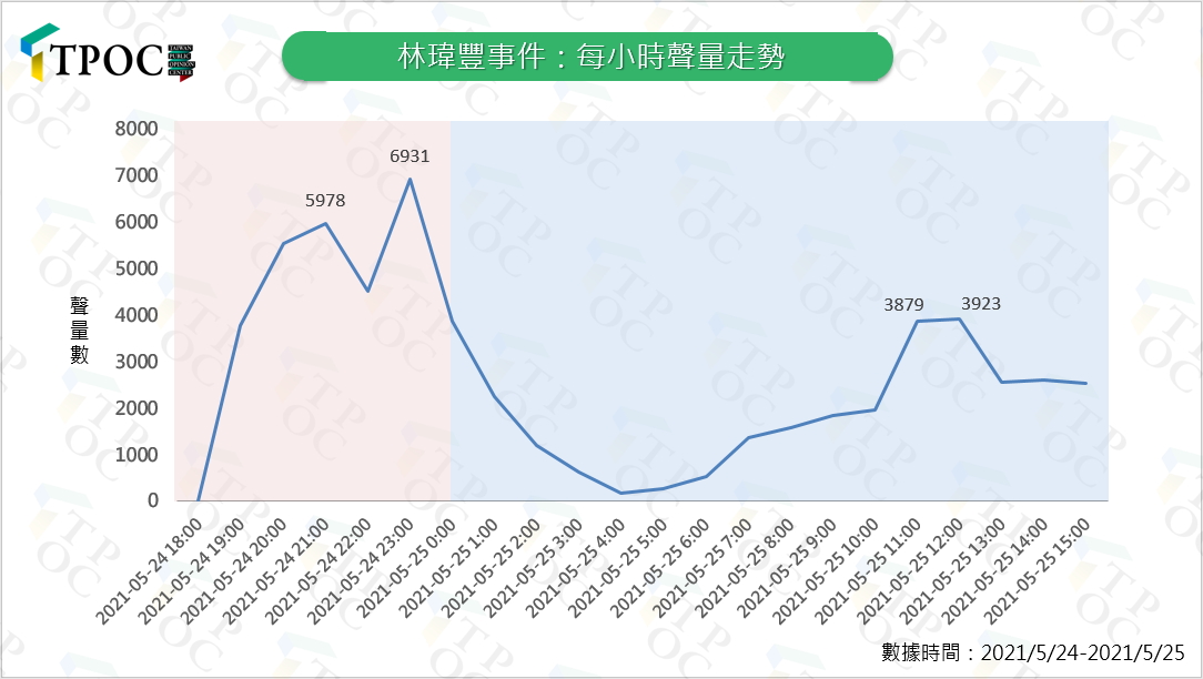 PTT鄉民為求自清非假訊息平台,自發調查林瑋豐背景,沒想到雪球越滾越大,民進黨後院火勢也一發不可收拾。TPOC監測林瑋豐的聲量走勢,自24日晚間6點開始呈現爆炸性的成長,深夜11點甚至達到單小時近7000則聲量,平均每小時有4300則,網友質疑他有何居心?為什麼一面批評政府,要陳時中下台、幫中國「大外宣」,另一面又發文稱PTT有人在抹黑疾管家,「自己指控自己帳號的反串」;並且,林陸續被挖出與民進黨多位重量級政治人物關係密切:不僅與民進黨網路社群中心副主任楊敏是夫妻,立委范雲更是其論文指導教授,令網友不敢相信自己看了什麼,「老師3+11毀了台灣防疫,徒弟搞反串認知作戰,要毀掉台灣最大BBS PTT」,議員徐巧芯更怒轟兩人是「認知作戰界的史密斯夫婦」。