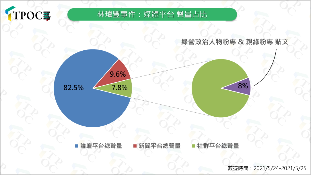 被爆出與民進黨關係密切,若林瑋豐「自導自演」屬實,那其意圖何在?又意欲謀求什麼?TPOC透過QuickseeK進一步監測「林瑋豐事件」在各媒體平台的發酵情況,發現絕大多數討論仍集中以PTT為首的論壇網站,占了82.5%,有46253則聲量,八卦版鄉民群情激憤,要林瑋豐出來面對;相反的,臉書社群僅占7.8%,4391則聲量。進一步細究,綠營政治人物粉專、親綠粉專,相關聲量更只占其中的8%,只有寥寥可數的338則——民進黨網路社群中心主任范綱皓曾指出,「社群經營者」要向支持者「下指令」,說明這回林瑋豐被看破手腳,綠營黨中央似乎下了「冷處理指令」,切割再切割,避談再避談。