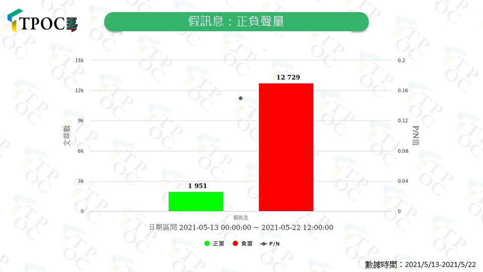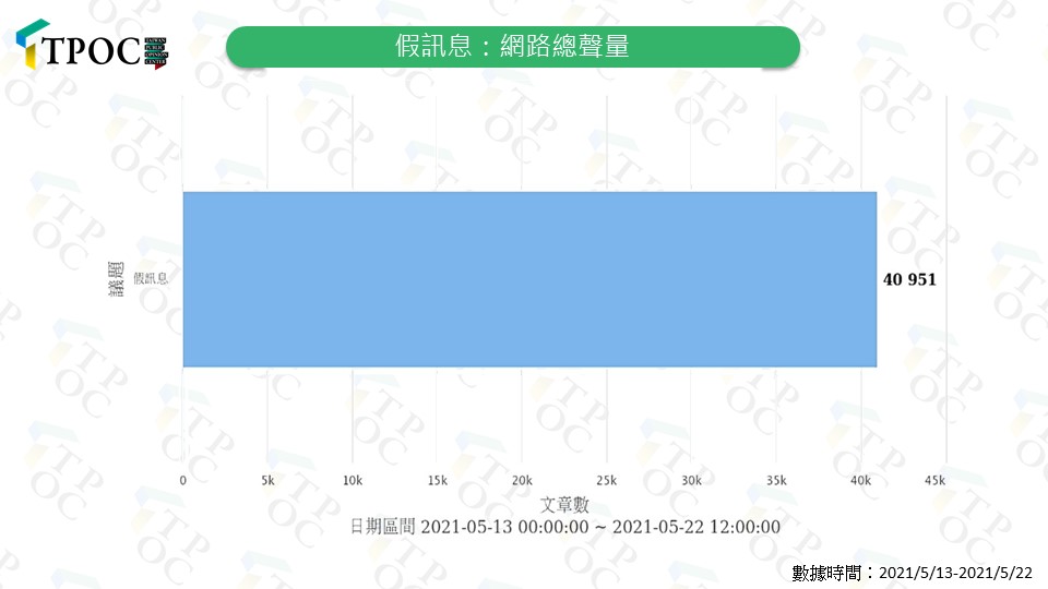 疫情持續嚴峻,至今(22)日已連續8日新增破百例確診,病毒擴散同時也伴隨著民眾的恐慌升高,以及疫情相關「假訊息」的出現。19日的指揮中心記者會,陳時中前8分鐘就提及5次「假訊息」,並強調相關消息以指揮中心公布為準,轉傳、散佈最高可罰新台幣300萬元或3年以下有期徒刑、拘役。TPOC透過QuickseeK監測,自13日以來,「假訊息」的討論聲量高達40951則,防假訊息儼然成為民進黨政府防疫工作下的重點項目。