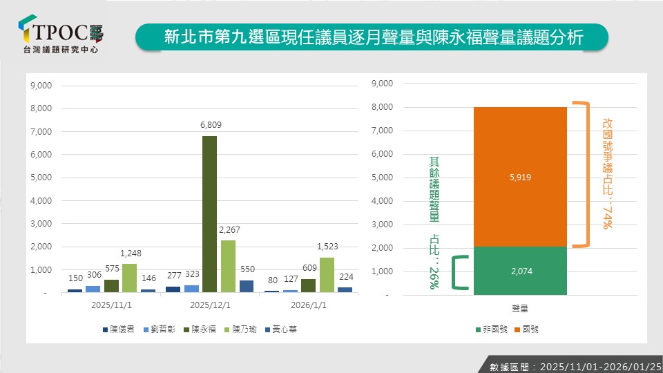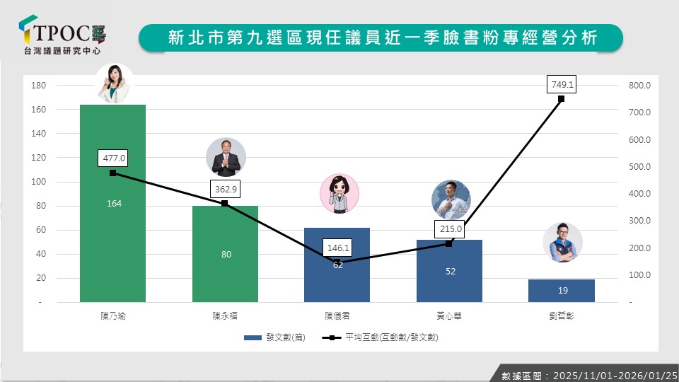 隨2026年九合一選舉將近,TPOC台灣議題研究中心透過QuickseeK快析輿情資料庫,分析新北市第九選區(新店、深坑、石碇、坪林、烏來)現任議員近一季的網路表現。數據顯示「聲量王」未必是「人氣王」,高聲量可能同時伴隨爭議,導致好感度下降。